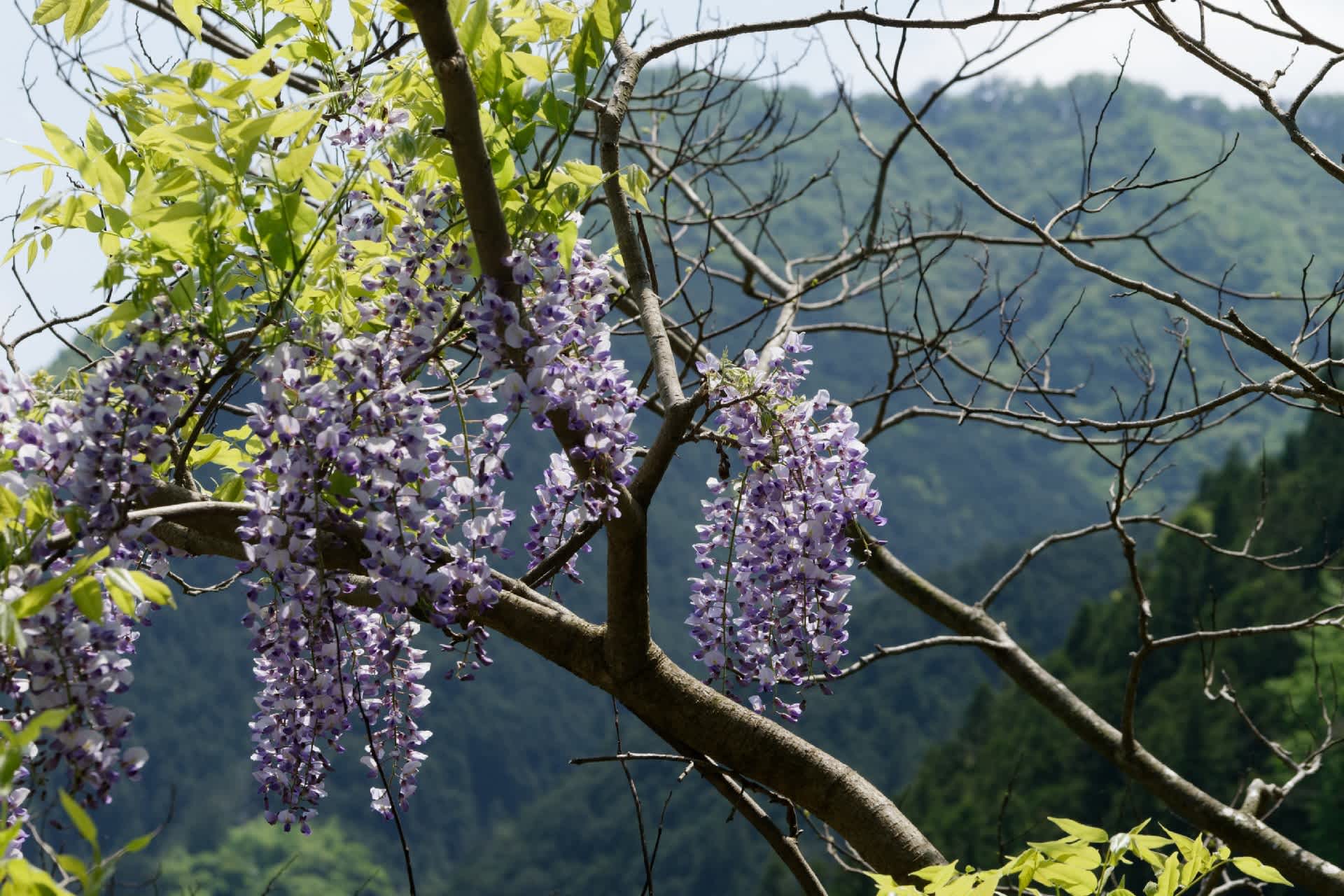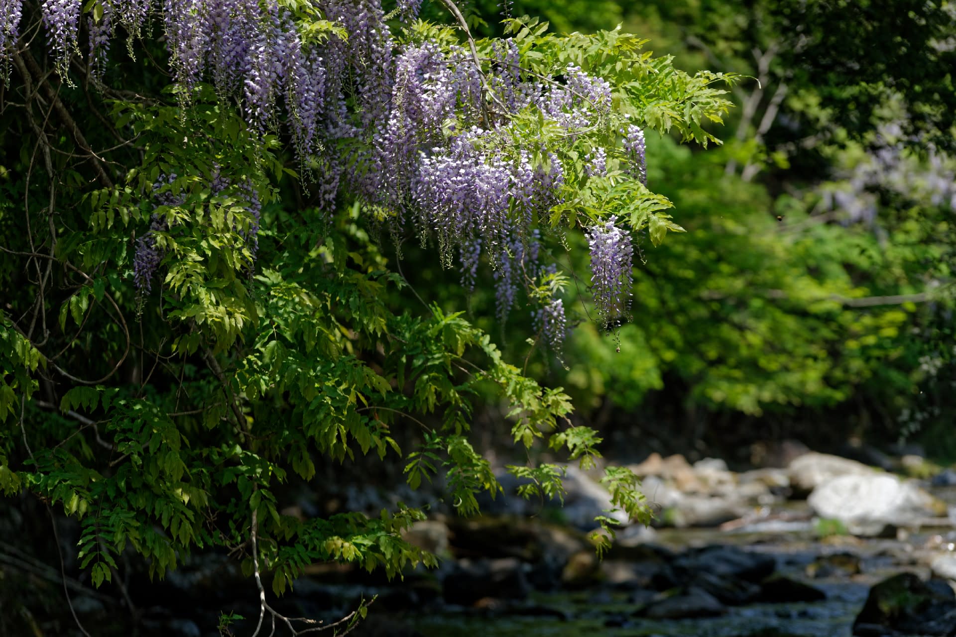 桐生の梅田の山に入る。杉林を進むと桐生川はどんどん渓谷となり極めて水も澄んでいる。林道の傍らは藤の花の盛り。藤棚の藤とは違った野趣がありとても好ましい。