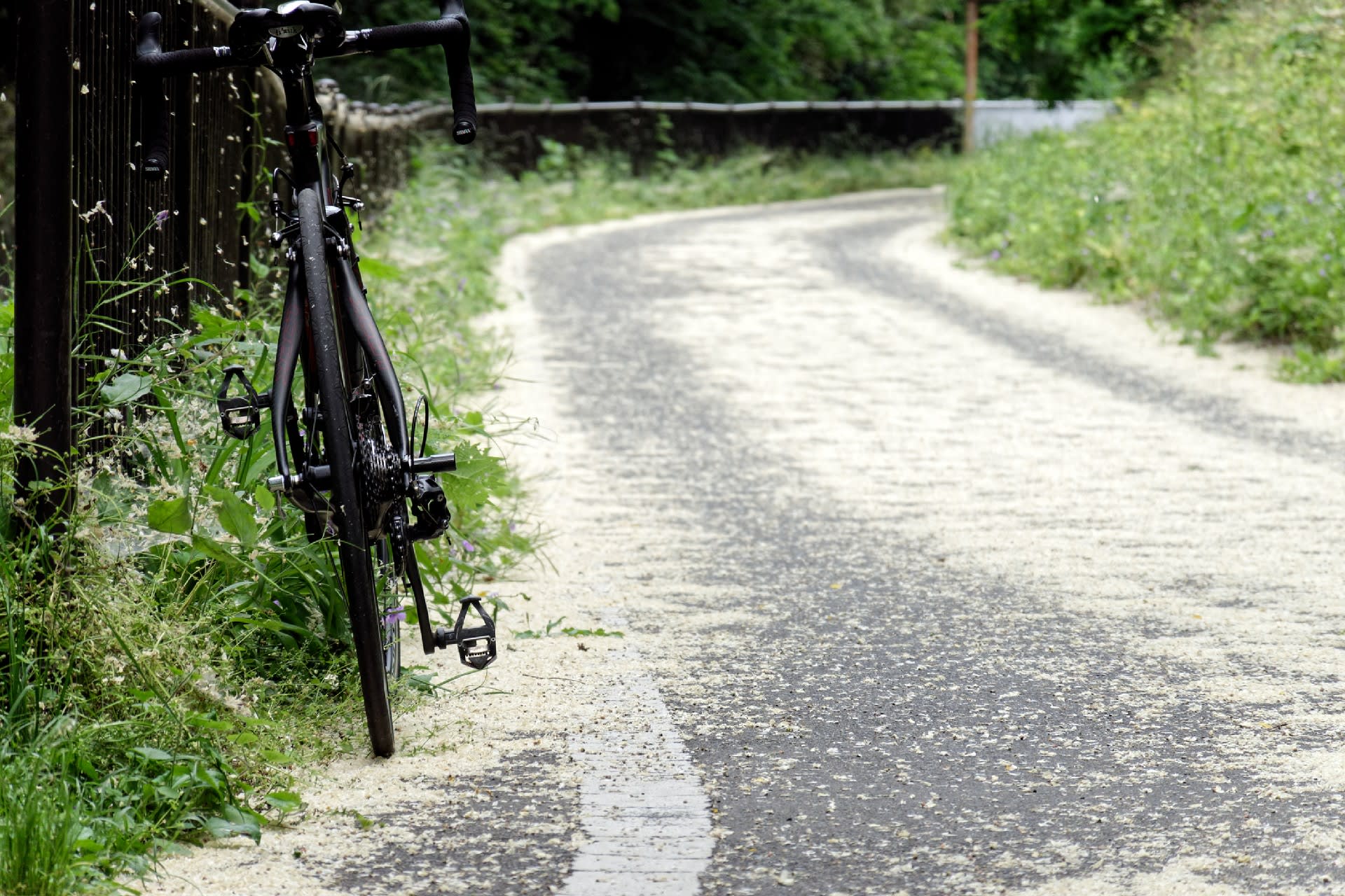 白い花びらも散るとややベージュ色。利根川サイクリングロード前橋、渋川区間はすっかり花が散って路面を覆う。