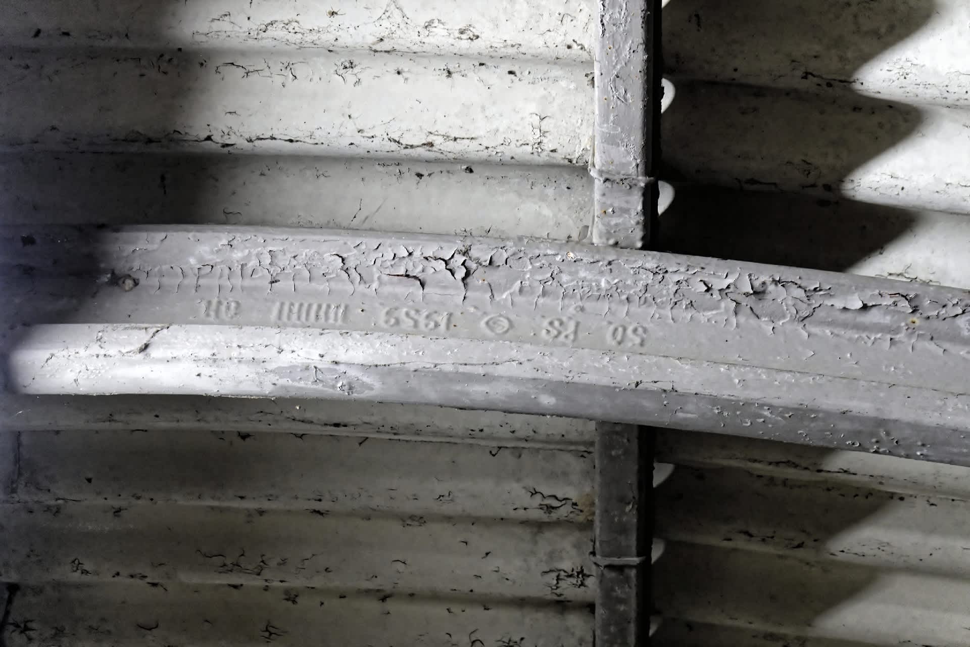 刻印から50kg PS型 八幡製作所平炉1959年製であることがわかる。幹線用のレールである。今までにみたレールの中では最大。のような気がする。