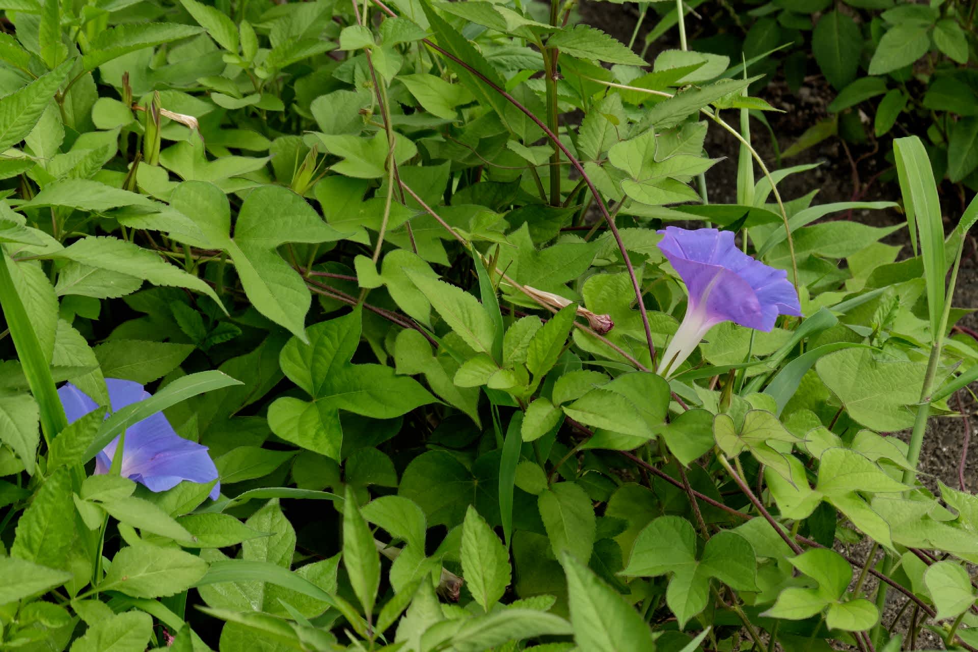 ボーッとしていたらやっと朝顔が咲きだす。誘引に失敗していたのでただの草むらで咲き始めてしまった。それでも今朝はフェンスを這い登った花が咲きだす。来年はちゃんと棚を作ろう。