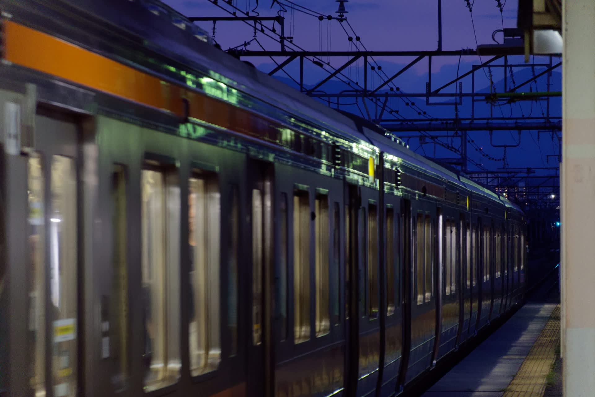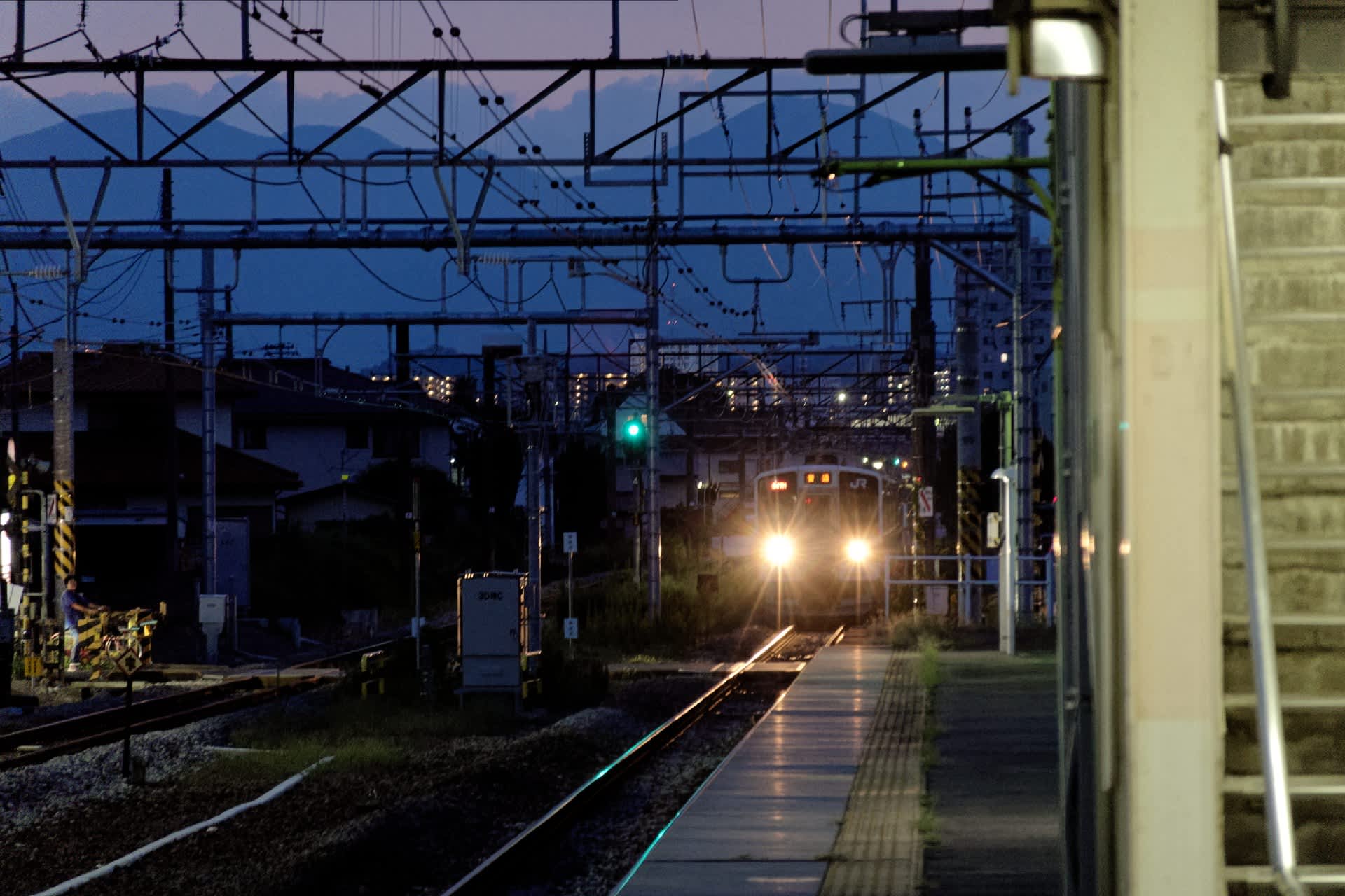 慌ててカメラを取り出し夕暮れの210系電車を撮影、手持ちで1/15、f=4.5、ISO1600、強力な手ブレ補正のおかげでなんとか写る。