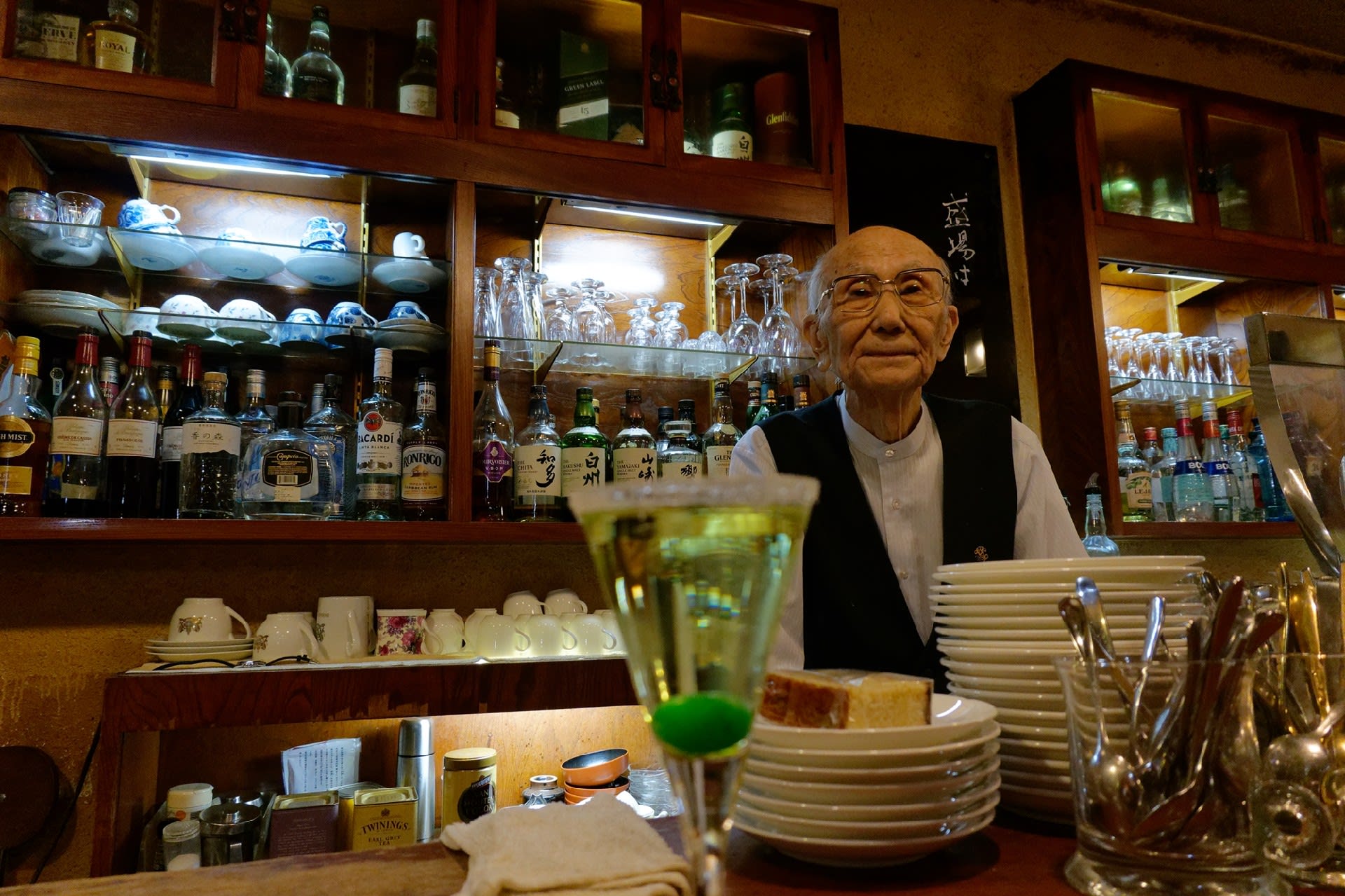 御歳93歳の現役。カクテル雪国の創案者であり映画にもなった方だ。非常にしっかりなさっていて雪国の入賞のときの話など60年前のことを昨日のことのように話していただいた。