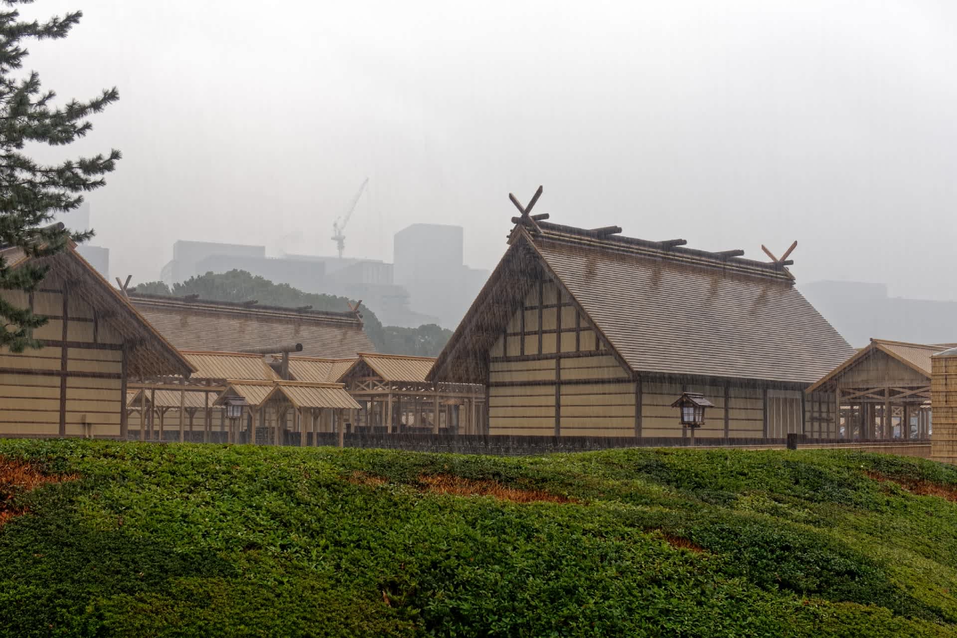 東御苑の大嘗宮を見学。雨のなか行列に加わる。プレハブ建築も加え複雑な構成のように見えるが平面図資料によればほぼシンメトリーの配置。おそらく耐震補強なのであろう小壁に筋交いが入ってややにぎやかな印象。本来であれは貫のみだと思うが。
