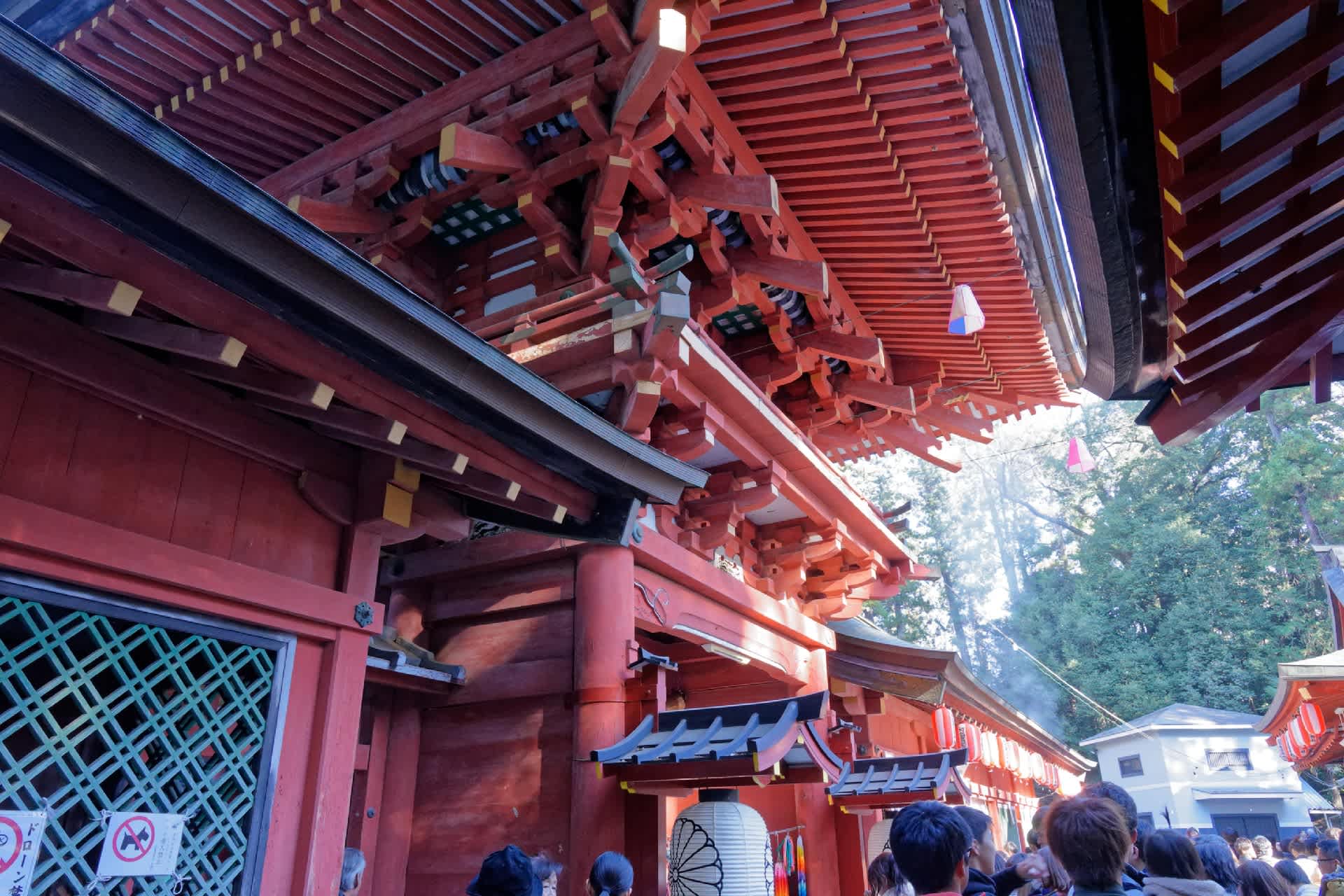 駅から坂道を上り、露天の待ち構える石段を登ると今度は下りの階段の前で渋滞。3回ほど規制を待って参拝する。